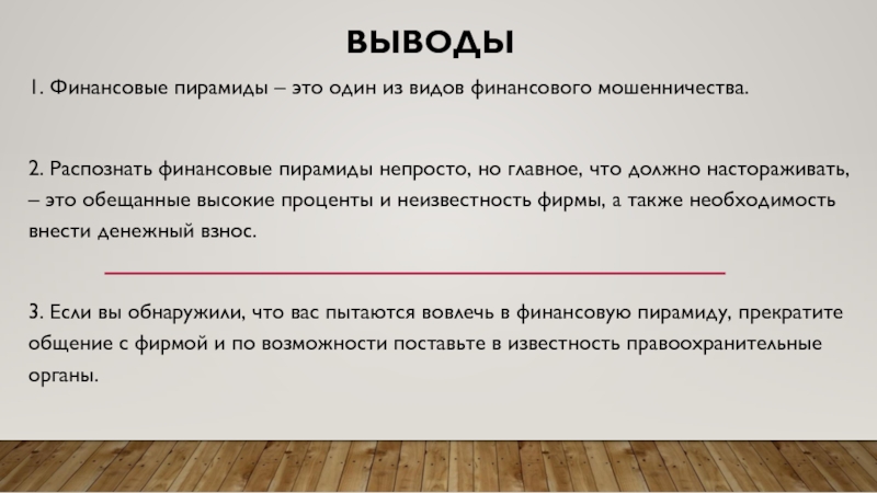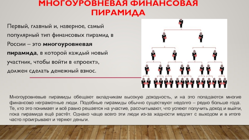 Многоуровневые пирамиды обещают вкладчикам высокую доходность, и на это попадаются многие финансово неграмотные люди. Подобные пирамиды обычно существуют недолго – редко больше года. Те, кто это понимает и всё равно решается на участие, рассчитывают, что успеют получить доход и выйти, пока пирамида ещё растёт. Однако чаще всего эти люди из-за жадности медлят с выходом и в итоге часто проигрывают и теряют деньги.