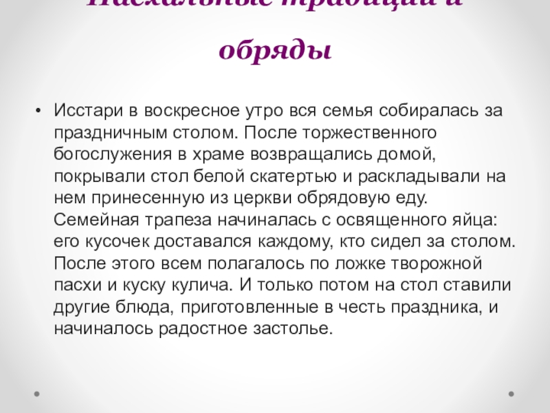 праздничным столом. После торжественного богослужения в храме возвращались домой, покрывали стол белой скатертью и раскладывали на нем принесенную из церкви обрядовую еду. Семейная трапеза начиналась с освященного яйца: его кусочек доставался каждому, кто сидел за столом. После этого всем полагалось по ложке творожной пасхи и куску кулича. И только потом на стол ставили другие блюда, приготовленные в честь праздника, и начиналось радостное застолье.