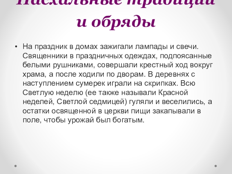 Священники в праздничных одеждах, подпоясанные белыми рушниками, совершали крестный ход вокруг храма, а после ходили по дворам. В деревнях с наступлением сумерек играли на скрипках. Всю Светлую неделю (ее также называли Красной неделей, Светлой седмицей) гуляли и веселились, а остатки освященной в церкви пищи закапывали в поле, чтобы урожай был богатым.