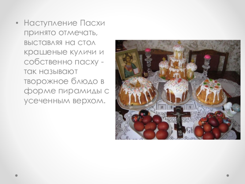 Слайд 4Наступление Пасхи принято отмечать, выставляя на стол крашеные куличи и собственно