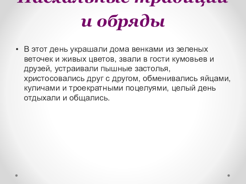 веточек и живых цветов, звали в гости кумовьев и друзей, устраивали пышные застолья, христосовались друг с другом, обменивались яйцами, куличами и троекратными поцелуями, целый день отдыхали и общались.
