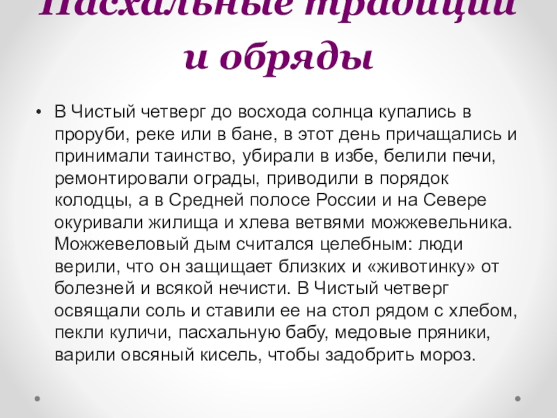 проруби, реке или в бане, в этот день причащались и принимали таинство, убирали в избе, белили печи, ремонтировали ограды, приводили в порядок колодцы, а в Средней полосе России и на Севере окуривали жилища и хлева ветвями можжевельника. Можжевеловый дым считался целебным: люди верили, что он защищает близких и «животинку» от болезней и всякой нечисти. В Чистый четверг освящали соль и ставили ее на стол рядом с хлебом, пекли куличи, пасхальную бабу, медовые пряники, варили овсяный кисель, чтобы задобрить мороз.