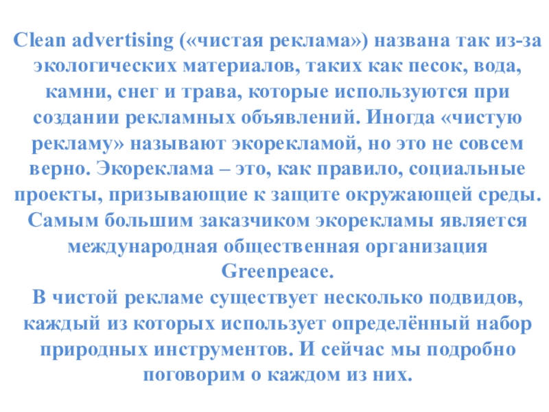 Слайд 2Clean advertising («чистая реклама») названа так из-за экологических материалов, таких как