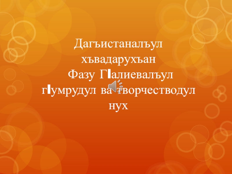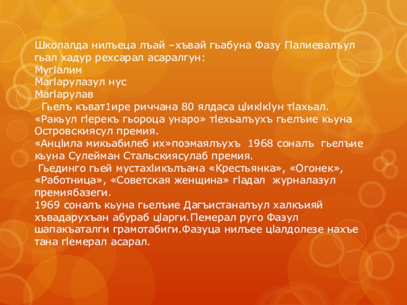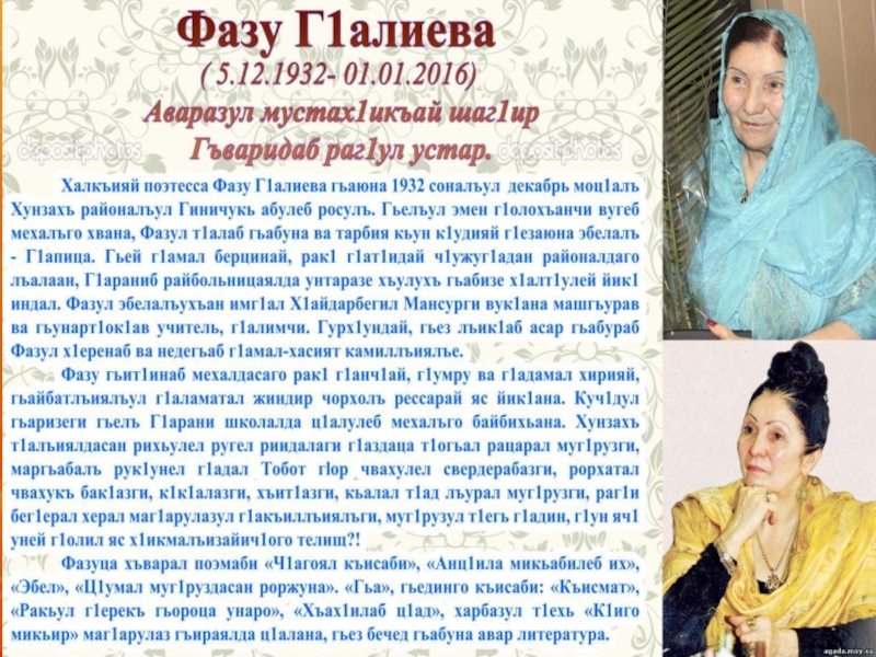 Презентация, доклад на тему Дагъистаналъул хъвадарухъан Фазу ГIалиевалъул гiумрудул ва творчестводул нух.