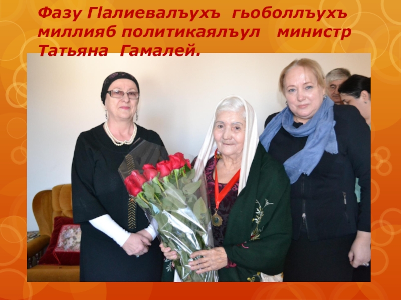 Слайд 7Фазу Гlалиевалъухъ гьоболлъухъ миллияб политикаялъул министр Татьяна Гамалей.