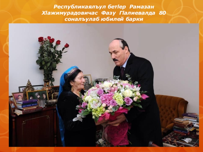 Слайд 14Республикаялъул бетlер Рамазан Хlажимурадовичас Фазу Гlалиевалда 80 соналъулаб юбилей барки