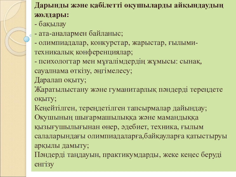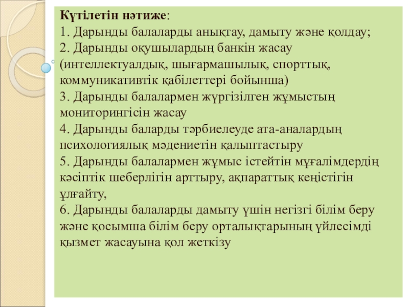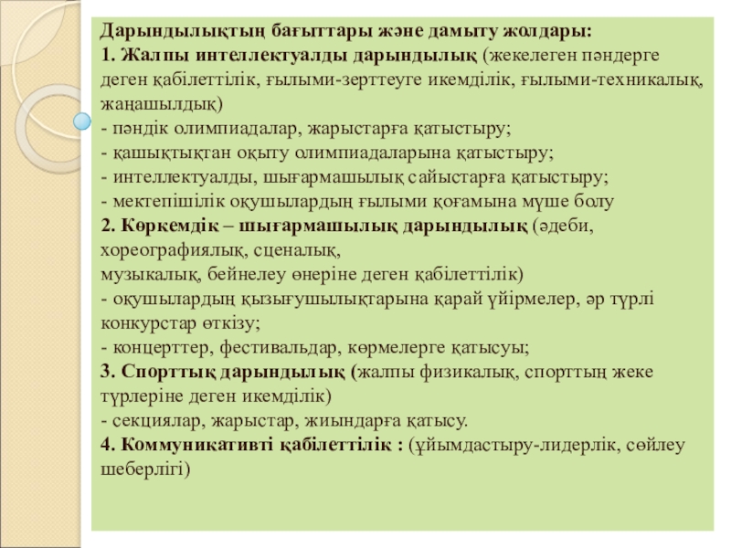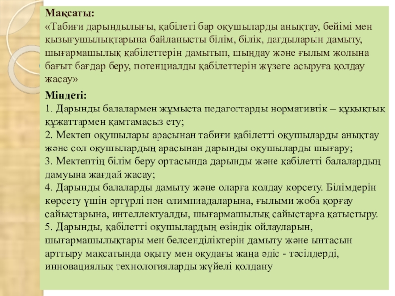 1. Дарынды балаларды анықтау, дамыту және қолдау;