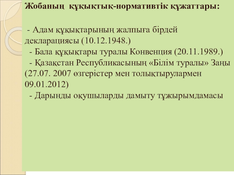 - Қазақстан Республикасының «Білім туралы» Заңы (27.07. 2007 өзгерістер мен толықтырулармен 09.01.2012)