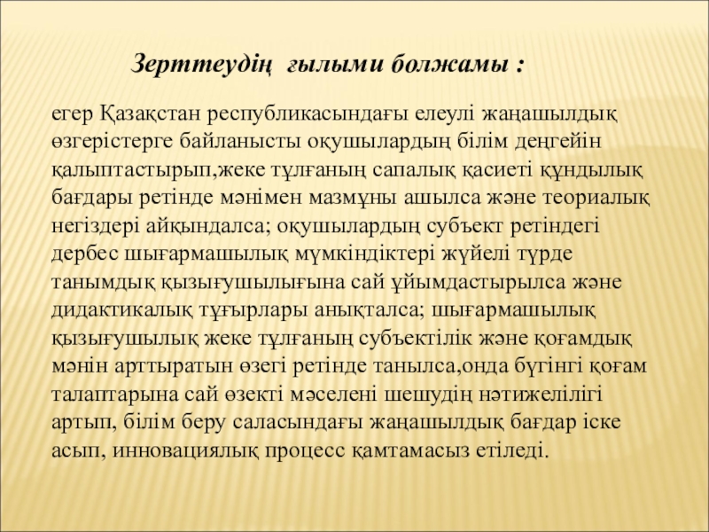 білім деңгейін қалыптастырып,жеке тұлғаның сапалық қасиеті құндылық бағдары ретінде мәнімен мазмұны ашылса және теориалық негіздері айқындалса; оқушылардың субъект ретіндегі дербес шығармашылық мүмкіндіктері жүйелі түрде танымдық қызығушылығына сай ұйымдастырылса және дидактикалық тұғырлары анықталса; шығармашылық қызығушылық жеке тұлғаның субъектілік және қоғамдық мәнін арттыратын өзегі ретінде танылса,онда бүгінгі қоғам талаптарына сай өзекті мәселені шешудің нәтижелілігі артып, білім беру саласындағы жаңашылдық бағдар іске асып, инновациялық процесс қамтамасыз етіледі.