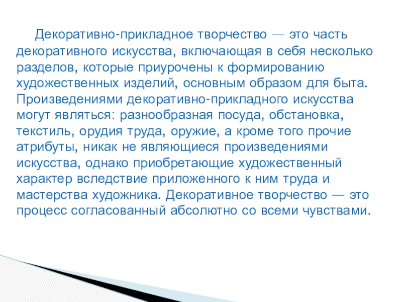 в себя несколько разделов, которые приурочены к формированию художественных изделий, основным образом для быта. Произведениями декоративно-прикладного искусства могут являться: разнообразная посуда, обстановка, текстиль, орудия труда, оружие, а кроме того прочие атрибуты, никак не являющиеся произведениями искусства, однако приобретающие художественный характер вследствие приложенного к ним труда и мастерства художника. Декоративное творчество — это процесс согласованный абсолютно со всеми чувствами.