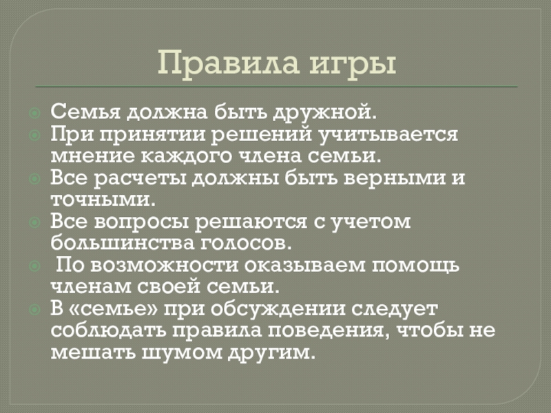 Правила игрыСемья должна быть дружной.При принятии решений учитывается мнение каждого члена семьи.Все расчеты должны быть верными и