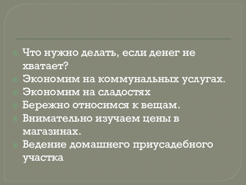 Что нужно делать, если денег не хватает?Экономим на коммунальных услугах.Экономим на сладостяхБережно относимся к вещам.Внимательно изучаем цены