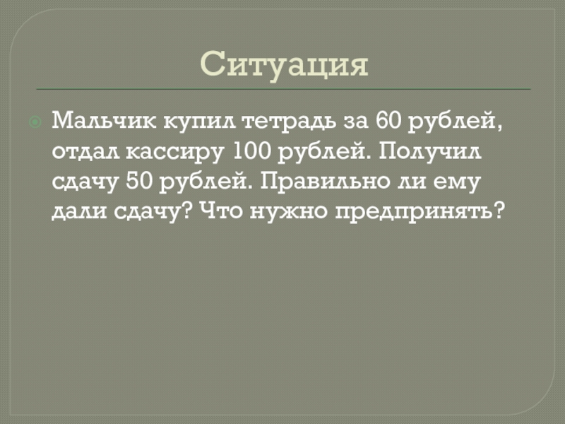 Ситуация Мальчик купил тетрадь за 60 рублей, отдал кассиру 100 рублей. Получил сдачу 50 рублей. Правильно ли