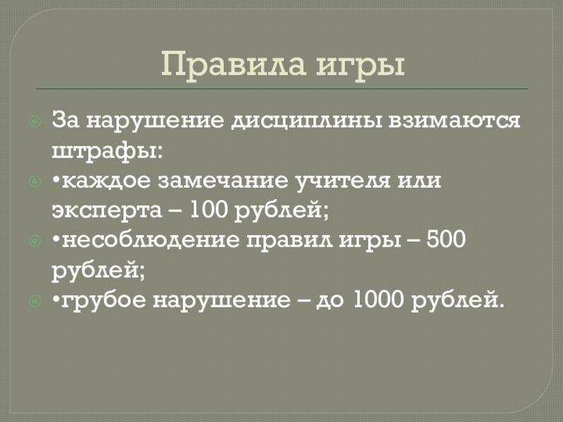 Правила игрыЗа нарушение дисциплины взимаются штрафы:•	каждое замечание учителя или эксперта – 100 рублей;•	несоблюдение правил игры – 500