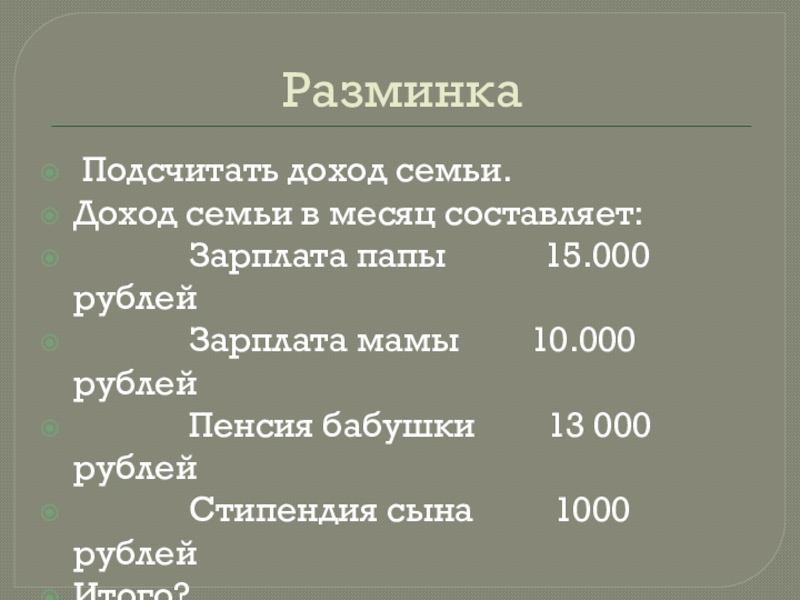 Разминка Подсчитать доход семьи.Доход семьи в месяц составляет:       Зарплата папы