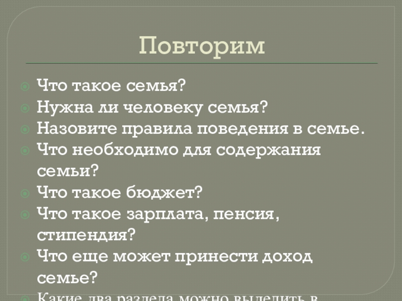 Повторим Что такое семья?Нужна ли человеку семья?Назовите правила поведения в семье.Что необходимо для содержания семьи?Что такое бюджет?Что такое зарплата, пенсия, стипендия?Что еще может принести доход семье?Какие два раздела можно выделить в структуре семейного бюджета?