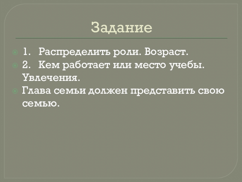 Задание 1.	Распределить роли. Возраст.2.	Кем работает или место учебы. Увлечения. Глава семьи должен представить свою семью.
