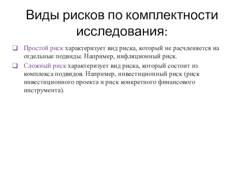 Сложный риск характеризует вид риска, который состоит из комплекса подвидов. Например, инвестиционный риск (риск инвестиционного проекта и риск конкретного финансового инструмента).