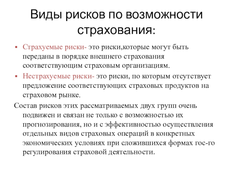 Состав рисков этих рассматриваемых двух групп очень подвижен и связан не только с возможностью их прогнозирования, но и с эффективностью осуществления отдельных видов страховых операций в конкретных экономических условиях при сложившихся формах гос-го регулирования страховой деятельности.