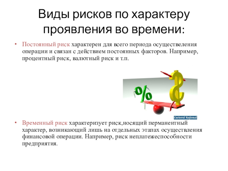 Временный риск характеризует риск,носящий перманентный характер, возникающий лишь на отдельных этапах осуществления финансовой операции. Например, риск неплатежеспособности предприятия.