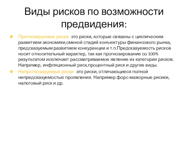 циклическим развитием экономики,сменой стадий конъюктуры финансового рынка, предсказуемым развитием конкуренции и т.п.Предсказуемость рисков носит относительный характер, так как прогнозирование со 100% результатом исключает рассматриваемое явление из категории рисков.Например, инфляционный риск,процентный риск и другие виды.