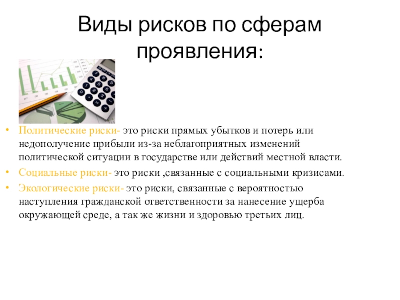 Экологические риски- это риски, связанные с вероятностью наступления гражданской ответственности за нанесение ущерба окружающей среде, а так же жизни и здоровью третьих лиц.