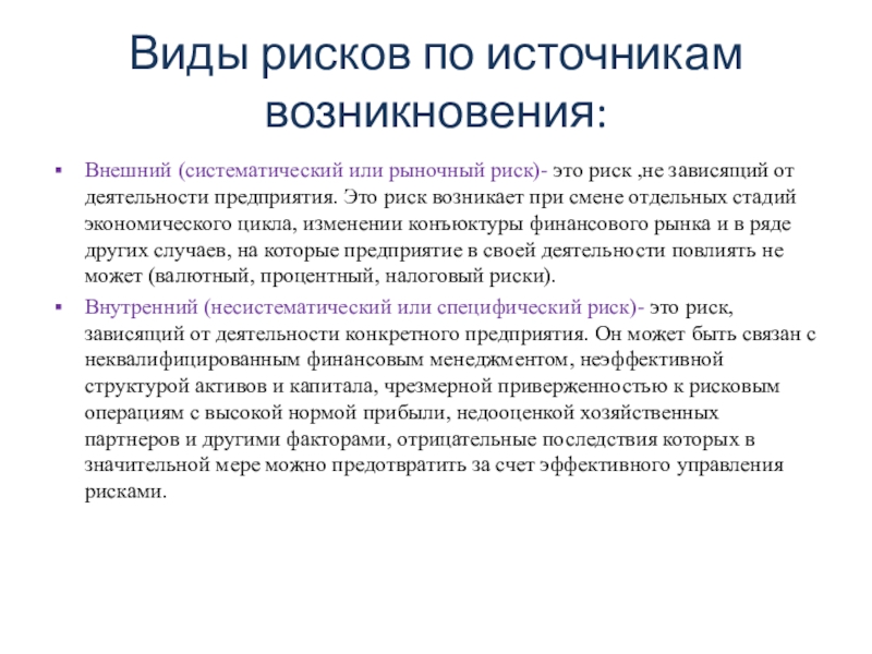 ,не зависящий от деятельности предприятия. Это риск возникает при смене отдельных стадий экономического цикла, изменении конъюктуры финансового рынка и в ряде других случаев, на которые предприятие в своей деятельности повлиять не может (валютный, процентный, налоговый риски).