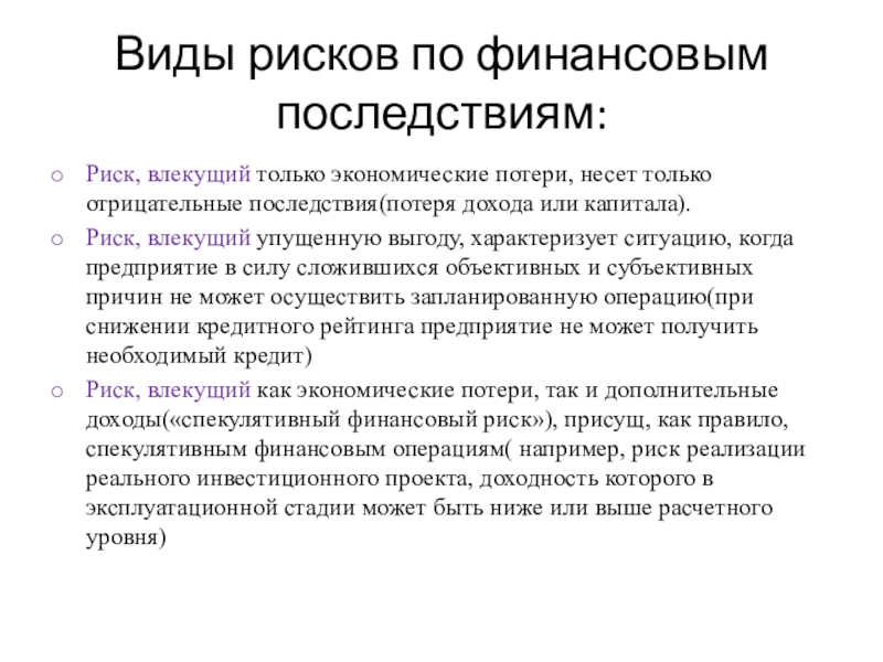 Риск, влекущий как экономические потери, так и дополнительные доходы(«спекулятивный финансовый риск»), присущ, как правило, спекулятивным финансовым операциям( например, риск реализации реального инвестиционного проекта, доходность которого в эксплуатационной стадии может быть ниже или выше расчетного уровня)