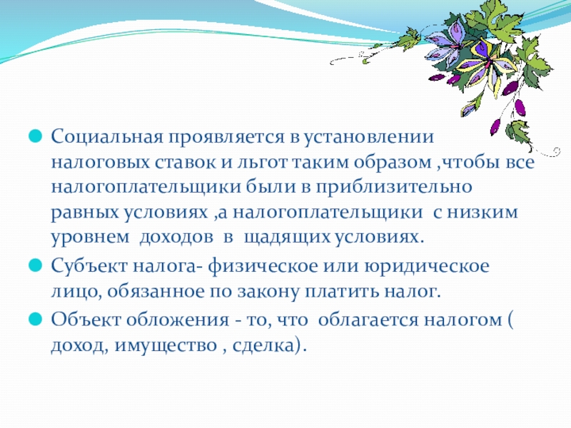 Слайд 6Социальная проявляется в установлении налоговых ставок и льгот таким образом ,чтобы