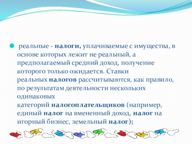 Слайд 15 реальные - налоги, уплачиваемые с имущества, в основе которых лежит не реальный,
