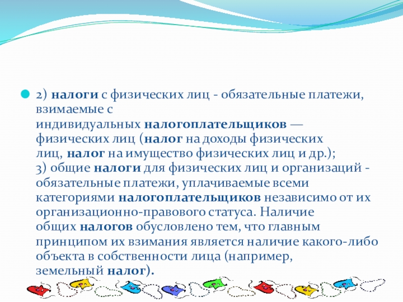 Слайд 132) налоги с физических лиц - обязательные платежи, взимаемые с индивидуальных налогоплательщиков — физических лиц