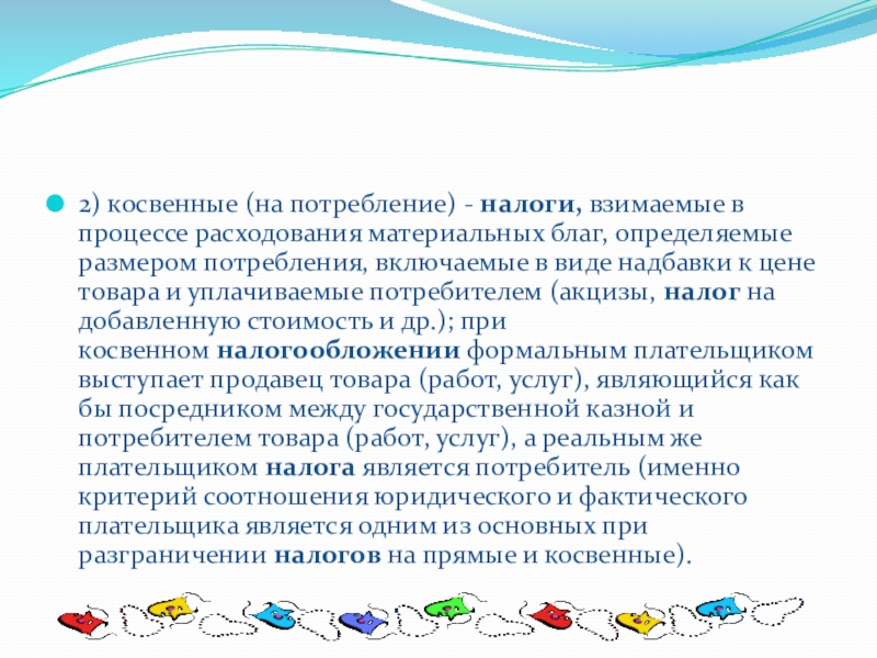 размером потребления, включаемые в виде надбавки к цене товара и уплачиваемые потребителем (акцизы, налог на добавленную стоимость и др.); при косвенном налогообложении формальным плательщиком выступает продавец товара (работ, услуг), являющийся как бы посредником между государственной казной и потребителем товара (работ, услуг), а реальным же плательщиком налога является потребитель (именно критерий соотношения юридического и фактического плательщика является одним из основных при разграничении налогов на прямые и косвенные).