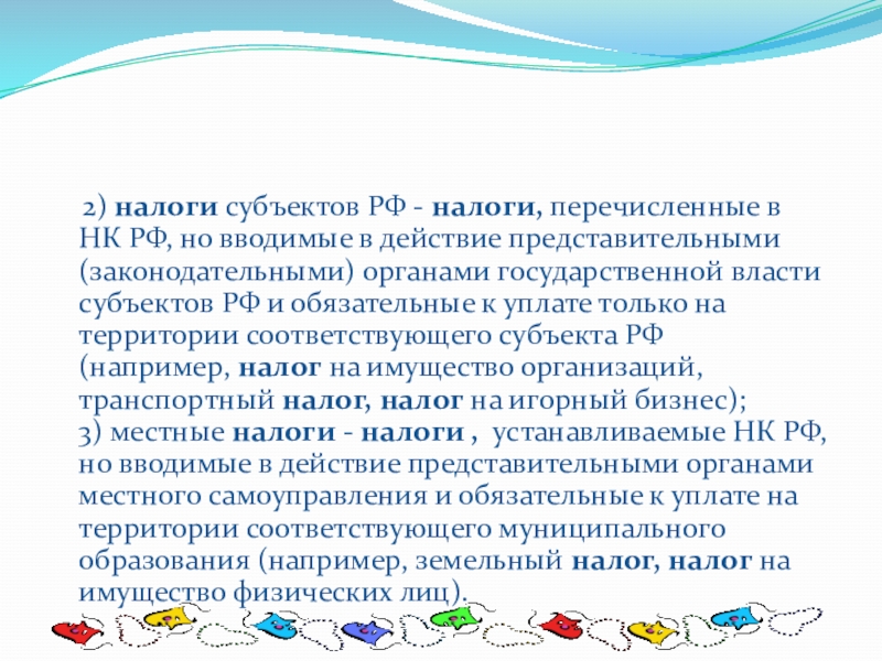 Слайд 18 2) налоги субъектов РФ - налоги, перечисленные в НК РФ, но вводимые в