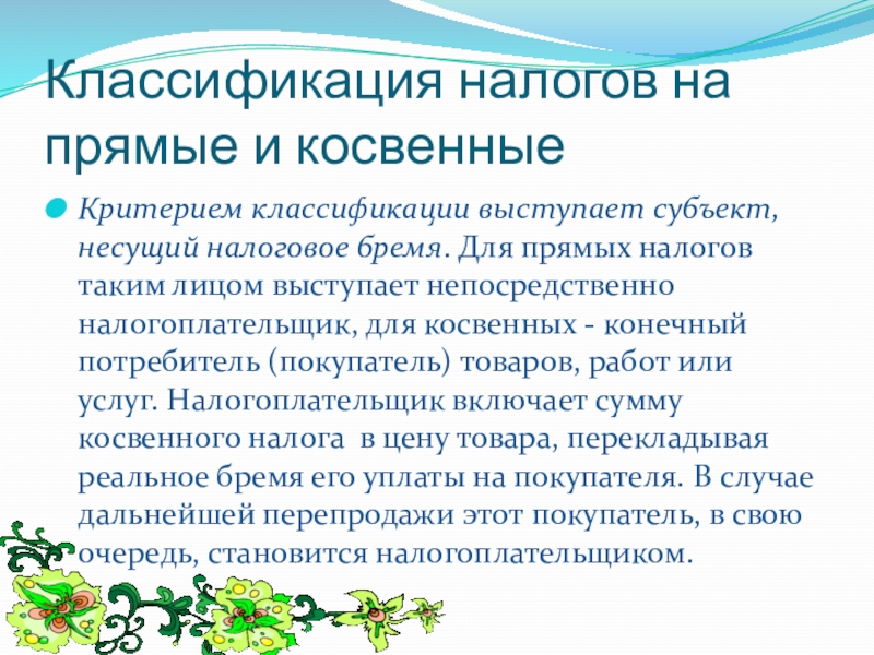бремя. Для прямых налогов таким лицом выступает непосредственно налогоплательщик, для косвенных - конечный потребитель (покупатель) товаров, работ или услуг. Налогоплательщик включает сумму косвенного налога в цену товара, перекладывая реальное бремя его уплаты на покупателя. В случае дальнейшей перепродажи этот покупатель, в свою очередь, становится налогоплательщиком.