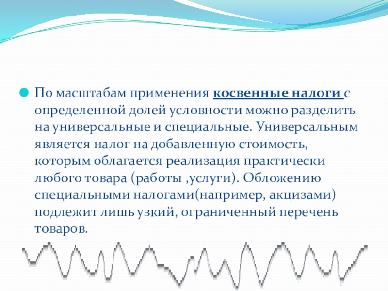 Слайд 9По масштабам применения косвенные налоги с определенной долей условности можно разделить