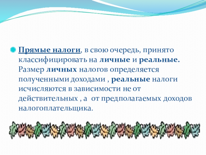 Слайд 8Прямые налоги, в свою очередь, принято классифицировать на личные и реальные.