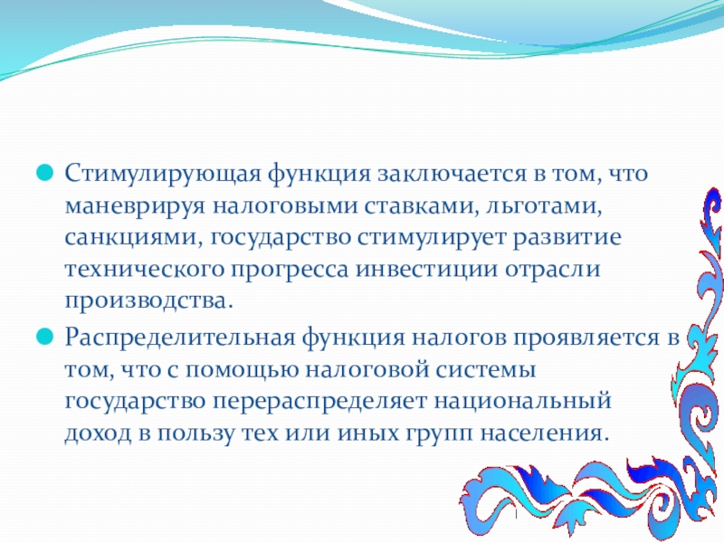 Слайд 4Стимулирующая функция заключается в том, что маневрируя налоговыми ставками, льготами, санкциями,