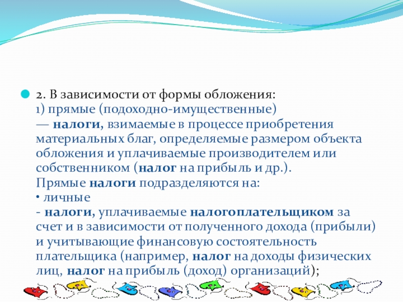 1) прямые (подоходно-имущественные) — налоги, взимаемые в процессе