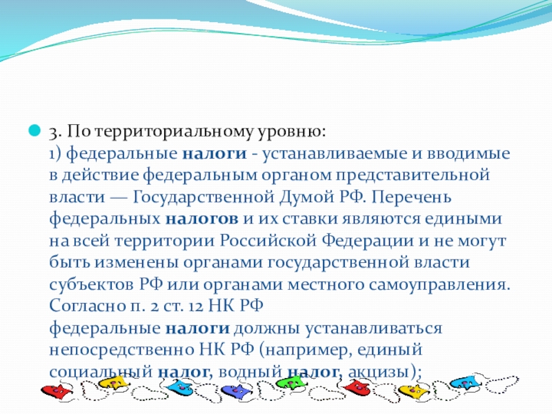 органом представительной власти — Государственной Думой РФ. Перечень федеральных налогов и их ставки являются едиными на всей территории Российской Федерации и не могут быть изменены органами государственной власти субъектов РФ или органами местного самоуправления. Согласно п. 2 ст. 12 НК РФ федеральные налоги должны устанавливаться непосредственно НК РФ (например, единый социальный налог, водный налог, акцизы);