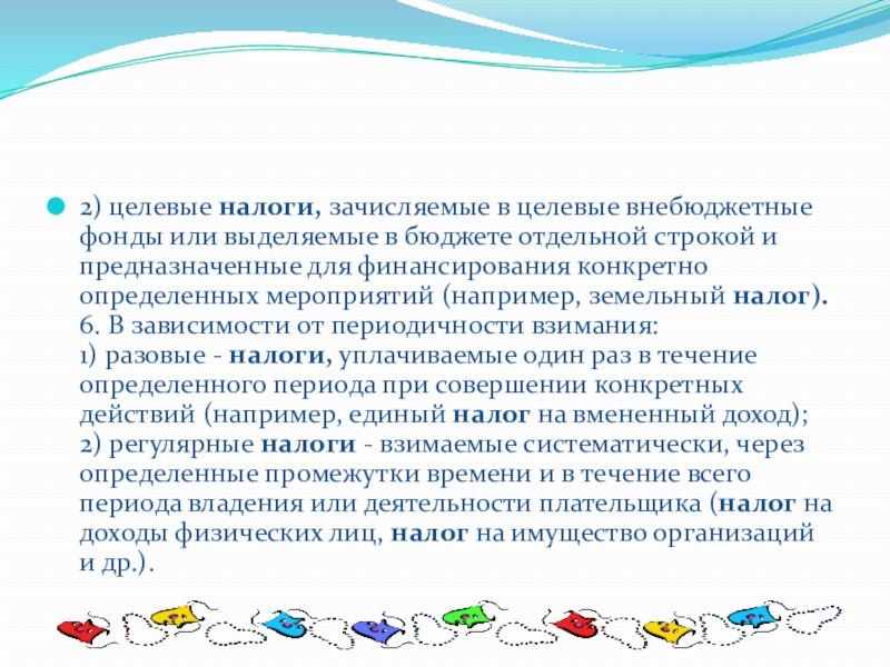 Слайд 202) целевые налоги, зачисляемые в целевые внебюджетные фонды или выделяемые в бюджете отдельной