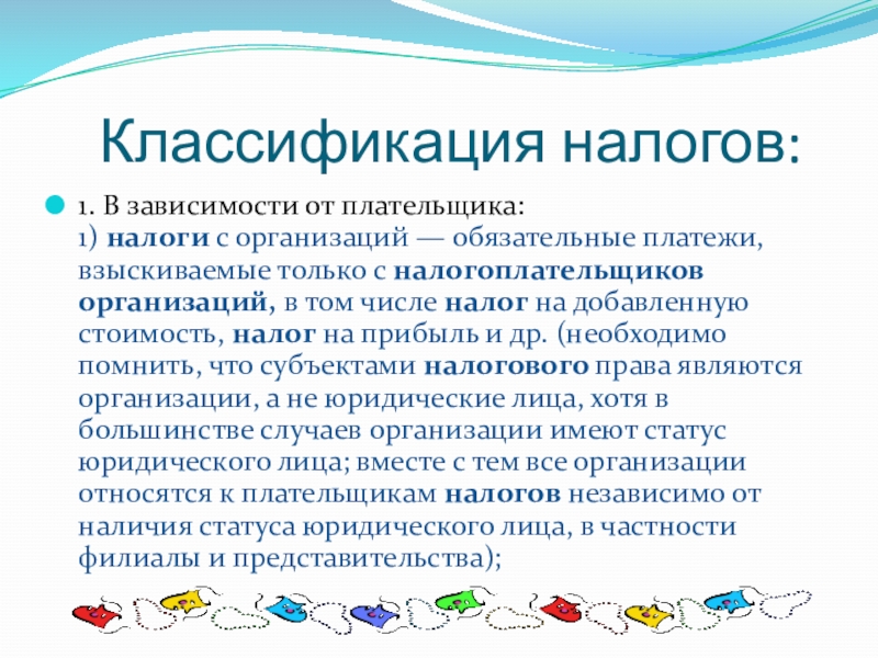 платежи, взыскиваемые только с налогоплательщиков организаций, в том числе налог на добавленную стоимость, налог на прибыль и др. (необходимо помнить, что субъектами налогового права являются организации, а не юридические лица, хотя в большинстве случаев организации имеют статус юридического лица; вместе с тем все организации относятся к плательщикам налогов независимо от наличия статуса юридического лица, в частности филиалы и представительства);