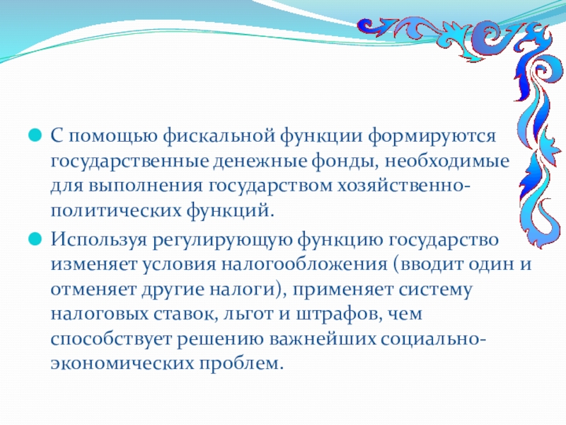 Слайд 3С помощью фискальной функции формируются государственные денежные фонды, необходимые для выполнения