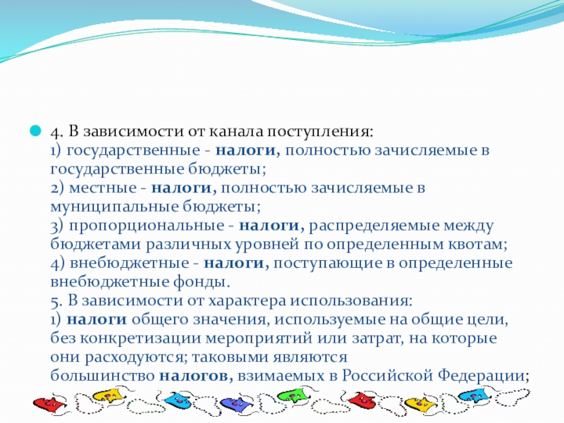 4) внебюджетные - налоги, поступающие в определенные внебюджетные фонды.