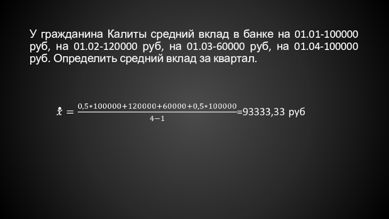 01.02-120000 руб, на 01.03-60000 руб, на 01.04-100000 руб. Определить средний вклад за квартал.