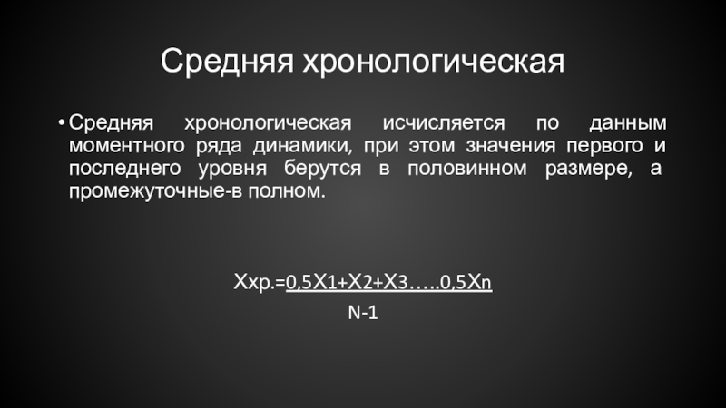 Средняя хронологическаяСредняя хронологическая исчисляется по данным моментного ряда динамики, при этом значения первого и последнего уровня берутся