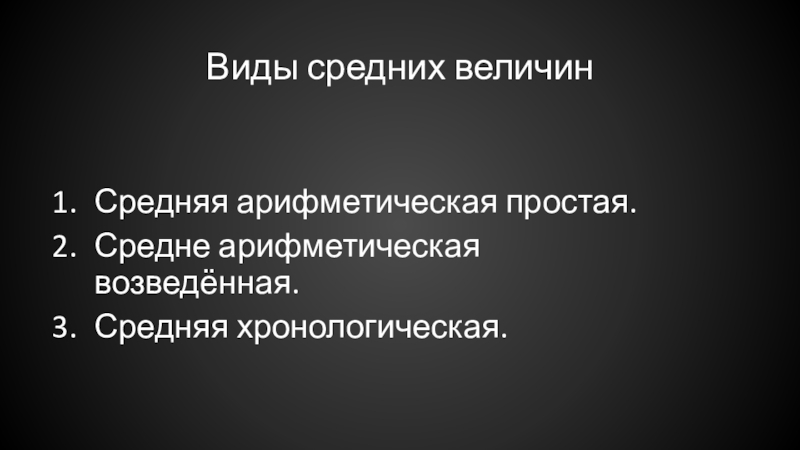 Виды средних величинСредняя арифметическая простая.Средне арифметическая возведённая.Средняя хронологическая.
