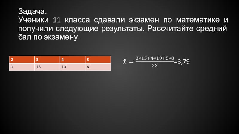 Задача. Ученики 11 класса сдавали экзамен по математике и получили следующие результаты. Рассчитайте средний бал по экзамену.