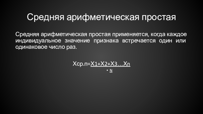 Средняя арифметическая простаяСредняя арифметическая простая применяется, когда каждое индивидуальное значение признака встречается один или одинаковое число раз.Хср.п=Х1+Х2+Х3…ХnN