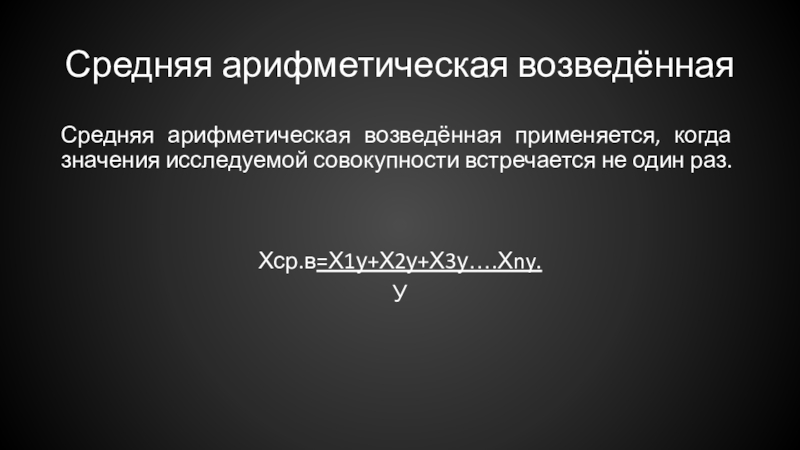 Средняя арифметическая возведённаяСредняя арифметическая возведённая применяется, когда значения исследуемой совокупности встречается не один раз.Хср.в=Х1у+Х2у+Х3у….Хny.У