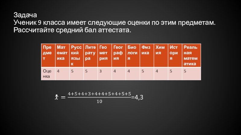 Слайд 5Задача Ученик 9 класса имеет следующие оценки по этим предметам. Рассчитайте средний